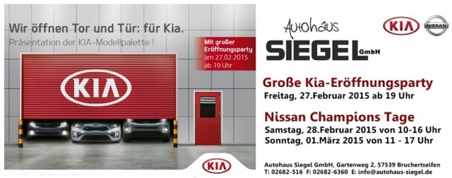 Bruchertseifen - Für das Team vom Autohaus Siegel steht im Jahr 2015 eine neue große Herausforderung an. Neben der vertrauten und lang bewährten Marke Nissan möchte das Team Ihnen eine noch größere Angebotsvielfalt mit Kia bieten. Daher möchten wir Sie ganz herzlich zu unserer großen Kia-Eröffnungsparty am Freitag, den 27. Februar 2015 ab 19 Uhr einladen. In einer spannenden Atmosphäre mit kleinen Snacks und Getränken präsentieren wir Ihnen die Kia-Modellpalette bei musikalischer Begleitung von DJ Oakes. Aber das ist noch lange nicht alles!