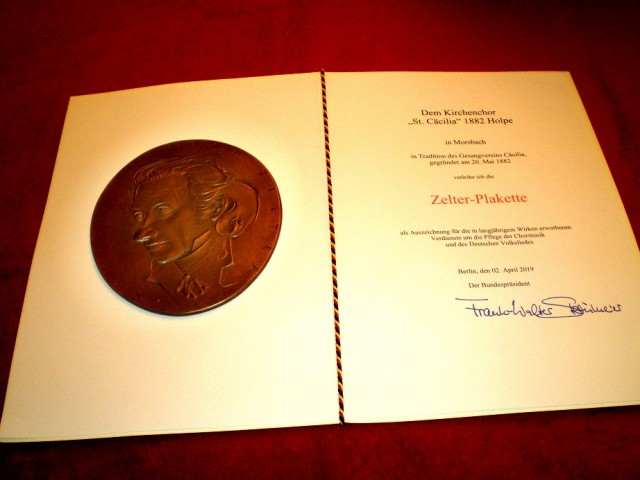 Stellvertretend für den Chor nahmen Vorsitzender Reinhold Mauelshagen und Chorleiter Dr. Dirk van Betteray Urkunde und bronzene Plakette entgegen, die auf der Vorderseite das Bildnis des Berliner Liedertafelgründers Carl Friedrich Zelter zeigt und auf der Rückseite den Bundesadler. Vorsitzender und Chorleiter freuten sich über diese Anerkennung langjähriger engagierter Arbeit im Dienste geistlicher und weltlicher Chormusik. Sie dankten besonders Schriftführer Dietmar Stangier für die umfangreiche Recherche, die im Vorfeld nötig war sowie allen Chormitgliedern für ihren unermüdlichen Einsatz.