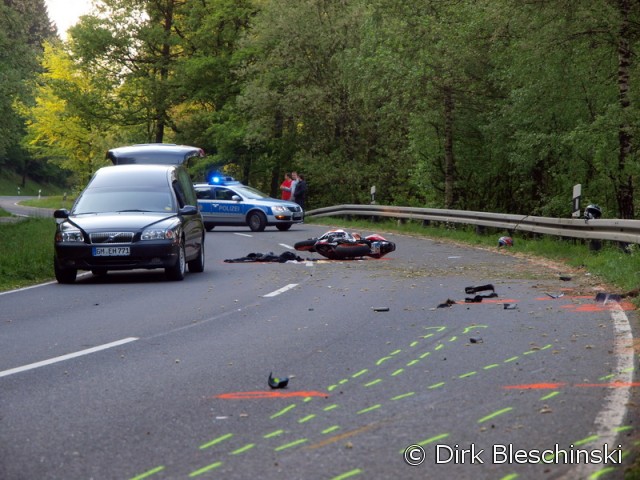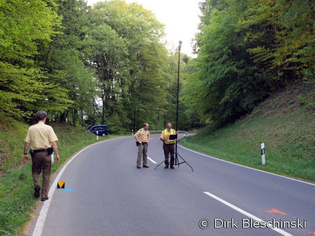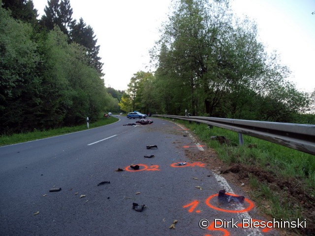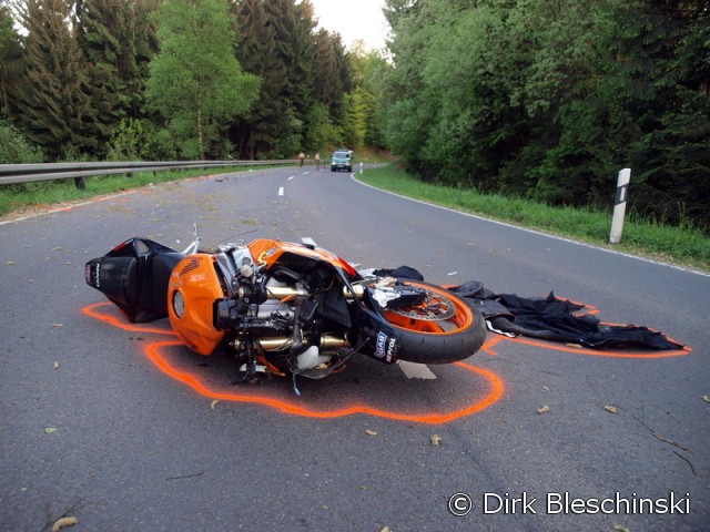 Laut Zeugenaussagen soll der 32-jährige Motorradfahrer mit hoher Geschwindigkeit auf der „Ideallinie“ gefahren sein und dabei einen entgegen kommenden PKW touchiert haben. Daraufhin verlor der Motorradfahrer die Kontrolle über sein Fahrzeug, kam zu Fall und schleuderte gegen die Leitplanke. Im Rahmen der Unfallaufnahme wurde seine tödlich verletzte Sozia drei Meter hinter der Leitplanke gefunden. Vermutlich ist der 32-jährige Motorradfahrer einer Gruppe nachfolgender Krads schnell voraus gefahren. Er wurde bei dem Unfall schwer verletzt und mit dem Rettungshubschrauber „Christoph 3“ in eine Kölner Klinik geflogen. Die tödlich verletzte Sozia hinerlässt ein sechsjähriges Kind.