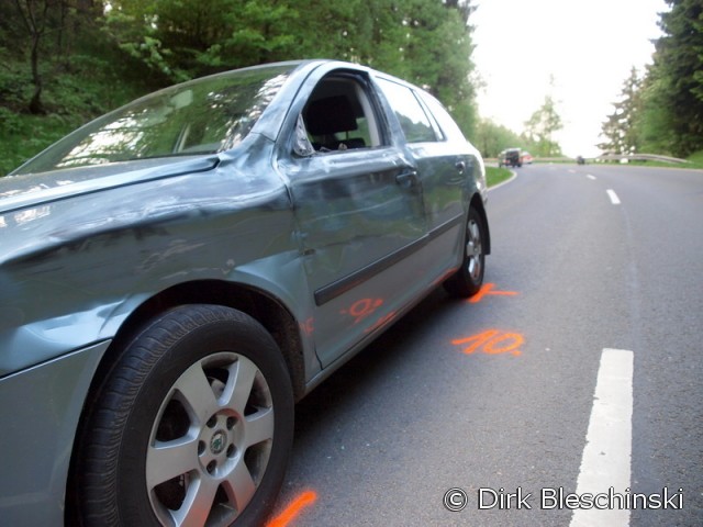 Die an der Unfallstelle eintreffenden Motorradfahrer erlitten einen Schock. Ein Kradfahrer wurde mit einem schweren Schock ins Gummersbacher Krankenhaus gebracht. Durch den harten seitlichen Aufprall auf den PKW und Glasbruch wurden der 22-Jährige Autofahrer sowie zwei weitere Mitfahrerinnen (15 und 19 Jahre) leicht verletzt. Es entstand schwerer Sachschaden.