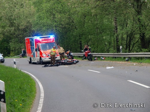 Lindlar - Zu einem schrecklichen Unfall mit einer tödlich verletzten Sozia und einem lebensgefährlich verletzten Kradfahrer kam es am Samstag auf der K 19 in Remshagen. Die nachfolgenden Motorradfahrer wurden mit teils schweren Schockzuständen ins Krankenhaus gebracht. Die Kreisstraße ist im Bereich der Unfallstelle noch voll gesperrt.