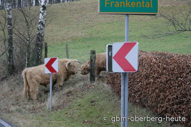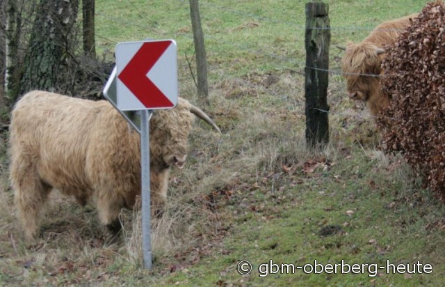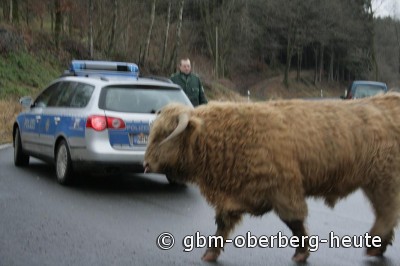 Beherzte Passanten hatten versucht, das friedliche Tier einzufangen und wieder auf die Weide zu bringen, doch der Bulle spielte nicht mit. Geschickt entzog er sich den Fangversuchen durch Fremde und ließ seinen Unmut an einem Verkehrszeichen aus. Dies allerdings eher halbherzig, seine ganze Kraft setzte der fesche Kerl nicht ein. Schließlich konnte der Tierhalter dem Ausflug des Bullen ein rasches Ende bereiten. Willig trottete der „Higlander“ hinter ihm her und ließ sich wieder auf die Weide bringen. Damit hatte auch für die Polizei der Einsatz „Bulle auf Abwegen“ ein gutes Ende genommen. (gbm-06.01.2012 07:50)