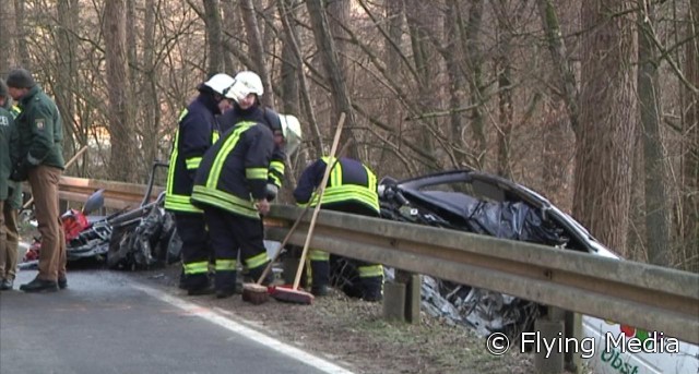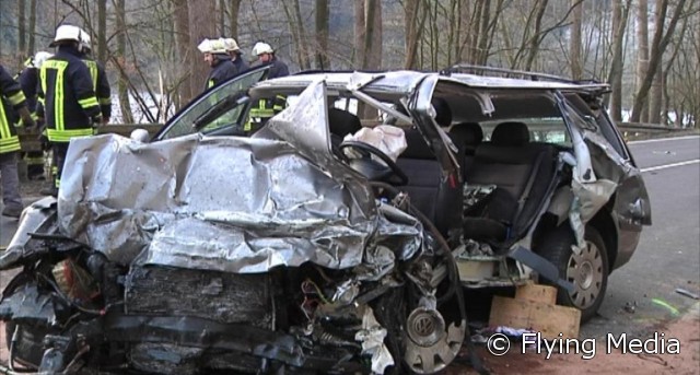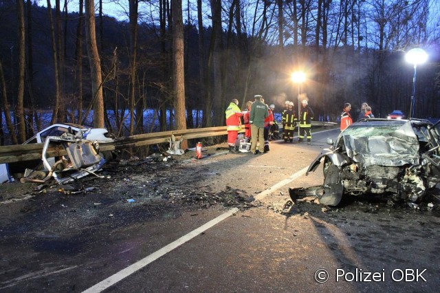 Durch die Wucht des Aufpralls wurde der Transporter über die Leitplanke in die angrenzende Böschung geschleudert. Beide Fahrer wurden in ihren Fahrzeugen eingeklemmt und verstarben noch an der Unfallstelle. Die Landstraße 284 war während der Unfallaufnahme bis gegen 13:30 Uhr voll gesperrt. (red-17.01.2012 10:13) (aktualisiert-17.01.2012 10:45)(aktualisiert-17.01.2012 12:10) (aktualisiert-17.01.2012 13:10 / 15:53 / 16:44)