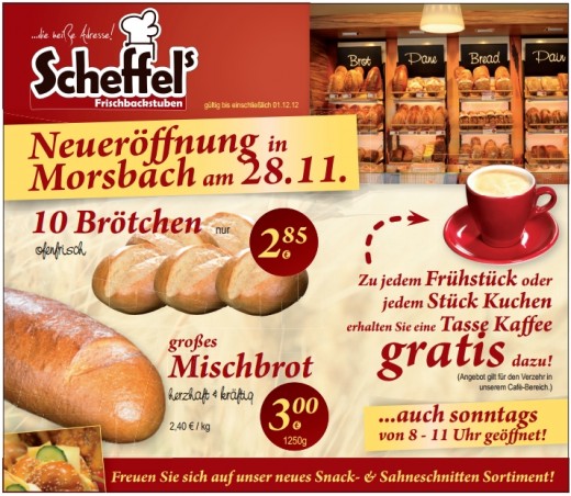 Morsbach - Zur Neueröffnung des REWE Marktes in Morsbach präsentiert Scheffel´s frische Backstuben verschiedene Frühstücksangebote, Kaffee Spezialitäten und reichhaltig belegte Snacks sowie Sahneschnitten.