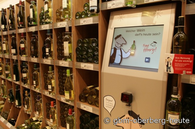 Eine Visitenkarte des neuen Marktes ist auch die erweiterte Weinabteilung. Freunde edler Tropfen werden hier ebenso fündig, wie Kunden, die einen günstigen Tafelwein suchen. Mit über 250 Weinsorten bietet der Markt ein umfangreiches Gesamtangebot. Der digitale Weinberater "Henry" unterstützt den Kunden bei der Wahl des passenden Weines für jeden Anlass.