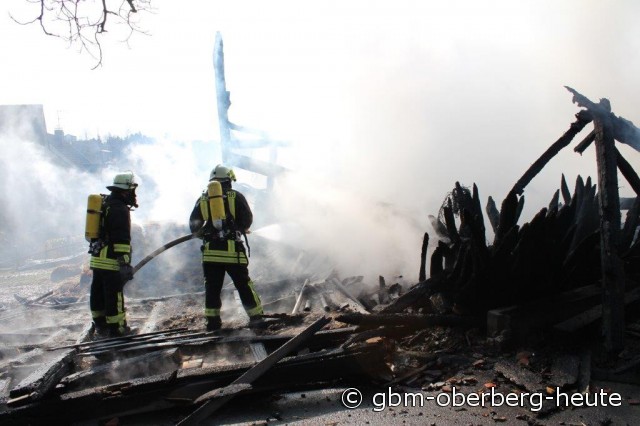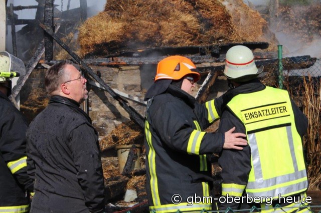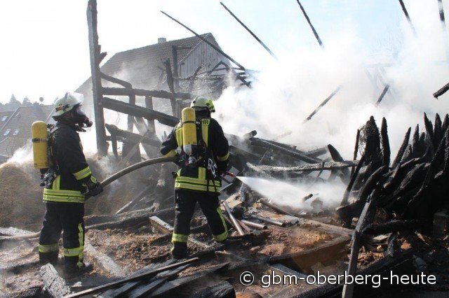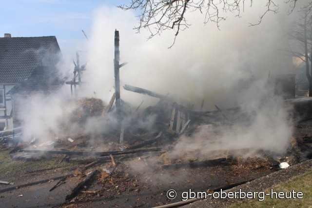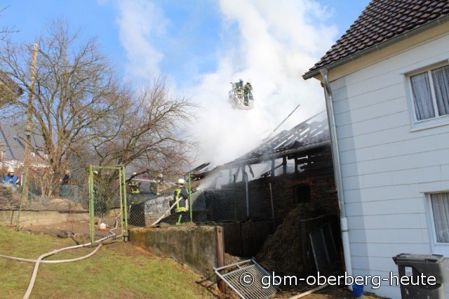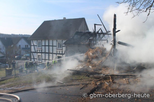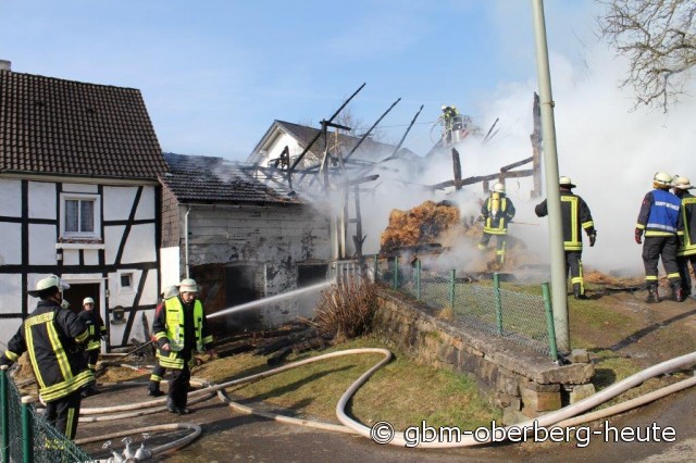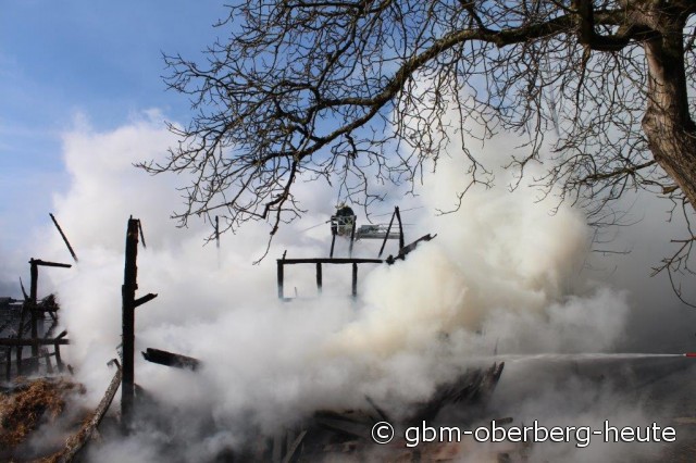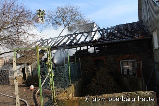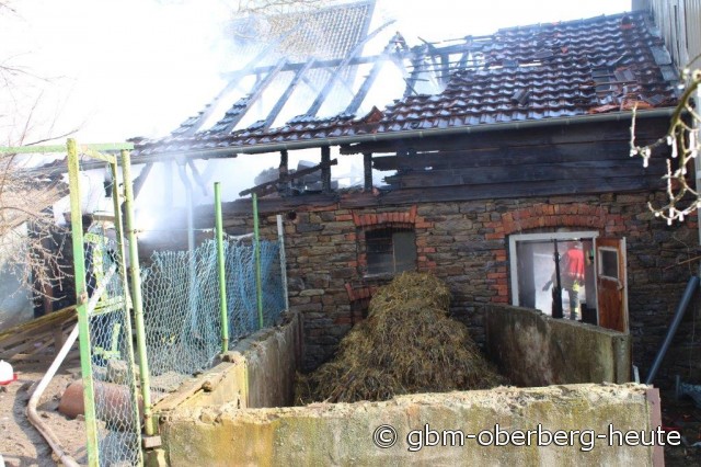 Nümbrecht - Im Ortskern von Nümbrecht kam es heute Morgen zum Vollbrand eines Stalls mit einem darüber liegendem Heulager. In dem Stall in der Straße "Am Hof" wurden Rinder und zwei Bullen gehalten. Die Rinder konnten von der Feuerwehr aus dem stark verqualmten Stall gerettet und auf eine angrenzende Wiese gebracht werden. Für die in einem anderen Stalltrakt des Fachwerkgebäudes untergebrachten Bullen kam jede Hilfe zu spät. Ein vor Ort anwesender Tierarzt musste die teils schwer verletzten Tiere erlösen.