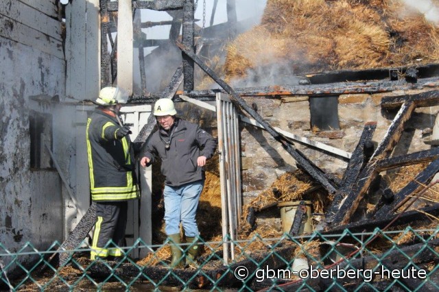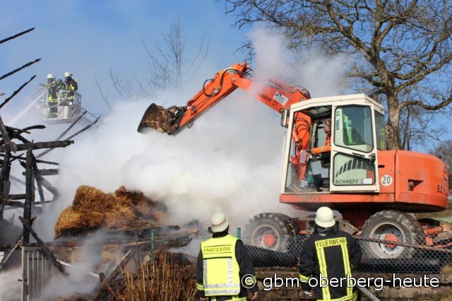 Um an die in dem brennenden Stall eingeschlossenen Bullen zu gelangen, rückte zur Unterstützung der Feuerwehr ein Bagger an, der brennende Heuballen entfernte und den Zugang zu den Tieren frei räumte.