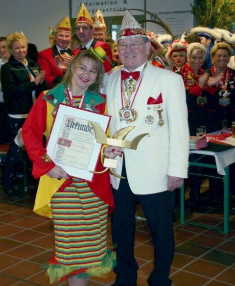 Bei der Preisverleihung zeigte sich Carmen Peffeköver überrascht und ergriffen, als ihr „Köbes“ Köckerling die GOLDENE NARRENKAPPE 2014 überreichte. Ihr Mann Michael, gleichzeitig auch auch 2.Vorsitzender der KG Närrische Oberberger, hatte die ahnungslose Carmen Peffeköver mit dem Schmölzjen des Kinderprinzenpaares nach Denklingen gelockt.
