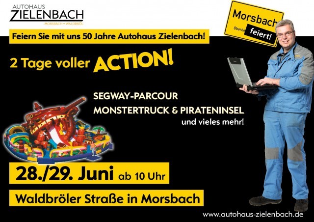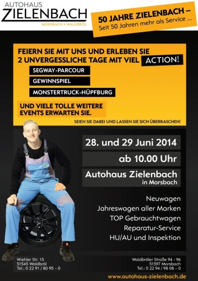 Morsbach/Waldbröl - Für das 50 jährige Firmenjubiläum hat das Autohaus Zielenbach in Morsbach ein tolles Rahmenprogramm auf die Beine gestellt. Zum 50 jährigen Firmenjubiläum möchten wir unsere Kunden, Geschäftspartner, Freunde und alle Interessierte einladen. Lassen Sie sich von viel Spaß und Action überraschen und feiern Sie am 28. und 29. Juni von 10 Uhr bis 17 Uhr ein ganzes Wochenende mit uns.