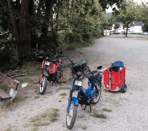 Heute sind Ukkat und Krull nach einem kräftigen Frühstück gegen 11 Uhr, nur mit Landkarten ausgestattet, ohne ein Navigationssystem gestartet. In ihre Mofa-Anhänger haben sie Espitkocher, etwas Werkzeug, Ersatzteile, Campingstühle und sonstige wichtige Reiseutensilien verstaut. Auf Facebook kann man ab dem Start der Tour täglich Berichte lesen und Fotos anschauen. www.facebook.com/toureasyrider . Die beiden Easy-Rider danken ihren Sponsoren Taxi Pieper, Kleve Bauelemente und dem KPM Rennteam. (gbm-30.05.2015 16:44)