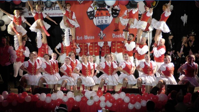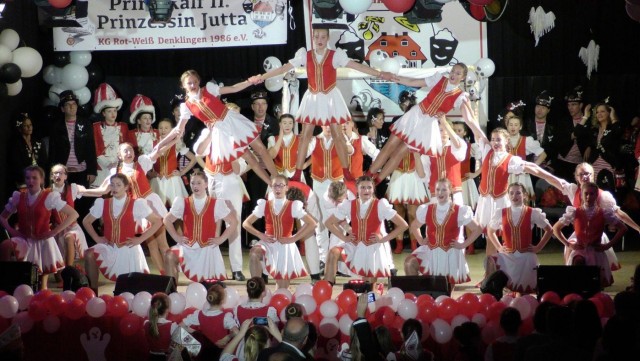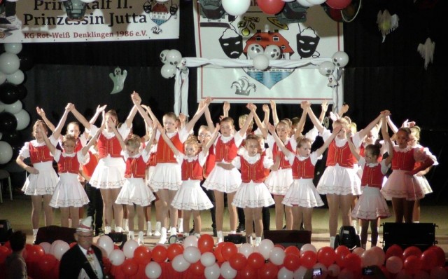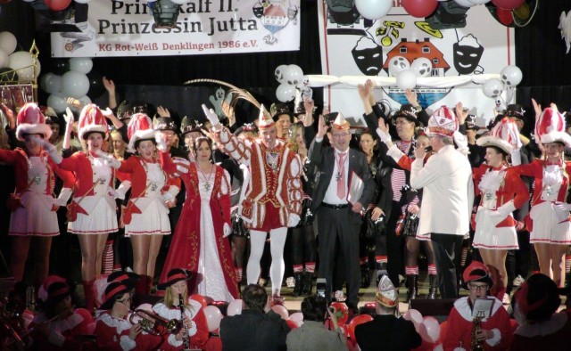 Nach dem Mottolied räumten die neuen „Denklinger Herrscher“ die Bühne, denn draußen wartete mit der „Micky Brühl-Band“ ein echter Knaller. Frontmann und „Chef“ Micky Brühl ließ sich auch nicht lange bitten und drehte den Saal quasi im Handumdrehen „auf links“. Mit seinem neuen Knaller „Ein Hoch auf die Liebe“, dem Kult-Song „Zo Foss noh Kölle jon“, „So jung wie hück“ und vielen anderen Hits räumte er ab und brachte die jecke Menge zum Tanzen, Singen und Schunkeln. Es folgte die „Talentschmiede der KG“, die Pänz von der Burg, seit Jahren unter bewährter Leitung der beiden „Fastelovends-Profis“ Claudia Burbach (Ex-Prinzessin) und Anne Ihmels (Ex-Prinz), denen es mit ihren Tänzen mühelos gelang, die Stimmung auf dem Siedepunkt zu halten, ehe dann die „Cöllner“ den Saal mit „Angelina“, „Die Nummer 1 vom Rhein, Hey Mädche“ und anderen Hits „rockten“.