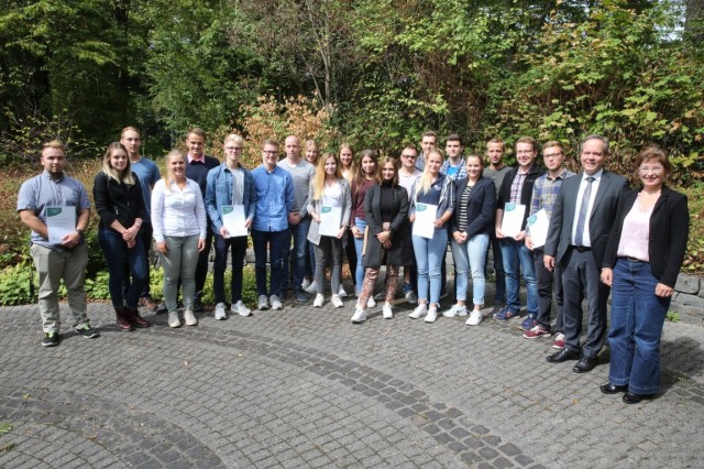 | Kreisdirektor Klaus Grootens (2.v.r) und Sylvia Asmussen, Unterstützung des Ehrenamts (r.), haben die Auszubildenden für ihr Engagement am Social Day mit einem Zertifikat ausgezeichnet. (Foto: OBK) |