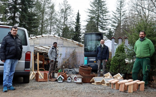 | Luis (li.) und Mulue (2. v. li.) von der BWO-Holzwerkstatt halfen Michael Hoffmann, Leiter der Holzwerkstatt, gerne dabei, ihre Arbeiten an Bernd Hebebrand (re.) von der Gartenbaumschule Blattwerk Oberberg auszuliefern. (Foto: BWO/F. Jansen) |