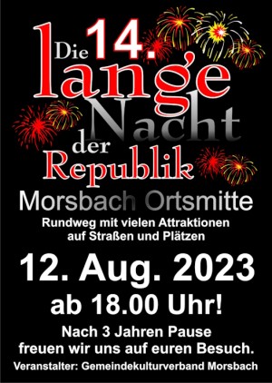 Morsbach - Nach dreijähriger Zwangspause steht am 12. August ab 18:00 Uhr mit der „14. Langen Nacht der Republik“ endlich wieder ein großartiges Highlight im Morsbacher Veranstaltungskalender. Der Ortskern der Südkreismetropole verwandelt sich dafür abermals in eine einzige Festmeile. Für das Publikum aus nah und fern hat das Organisationteam des Gemeindekulturverbandes ein abwechslungsreiches Unterhaltungsprogramm für Jung und Alt zusammengestellt, was sich sehen lassen kann.