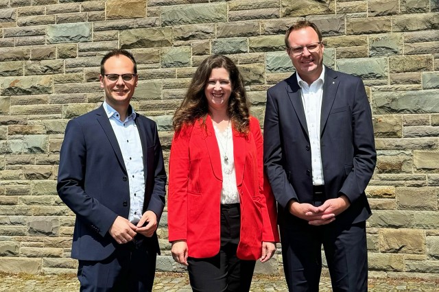 | In Lindlar begrüßten Regionaldirektor Manuel Peters (l.) und Vorgänger Rafael Niedung die neue Leiterin der Filiale, Verena Schneider. (Foto: KSK Köln) |