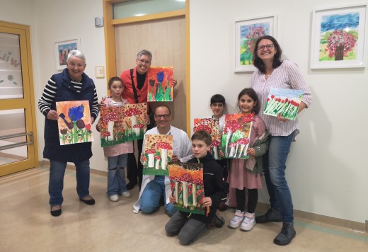 Gummersbach - Die Kinder der Kunstwerkstatt des Förderkreises für Kinder, Kunst & Kultur in Bergneustadt e.V., unter der Leitung von Diplom Grafik-Designerin Andrea Perthel, schenkten der Klinik für Kinder- und Jugendmedizin am Kreiskrankenhaus Gummersbach rund 30 ihrer Kunstwerke. Stellvertretend für alle Kinder der Kunstwerkstatt überreichten Yasmin, Deniz, Niklas und Enissa gemeinsam mit Andrea Perthel und Meike Krämer-Ansari, Vorsitzende des Förderkreises, dem Chefarzt Dr. Roland Adelmann ihre selbstgestalteten Pilzbilder. Die sechsjährige Yasmin sagte: „Ich schenke mein Bild für die kranken Kinder, damit sie schnell wieder gesund werden.“