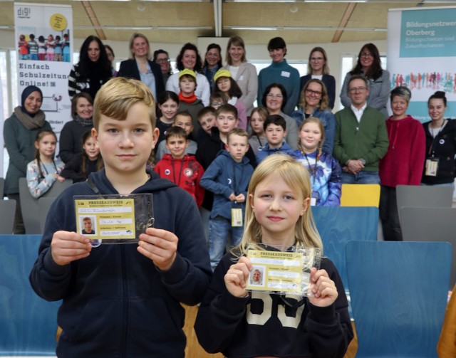 Davin (4. Klasse) und Hanna (2. Klasse) können sich jetzt als Journalisten der Online-Zeitung ausweisen: An fünf Grundschulen im Oberbergischen Kreis lernen Kinder mittels "digi.reporter" multimediale Beiträge zu erstellen. (Foto: OBK)