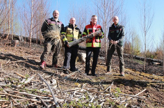 Stefan Wende (Feuerwehrfachberater Forst des Regionalforstamtes Bergisches Land), Manuel Packhäuser (KBM Rheinisch-Bergischer Kreis), Julian Seeger (KBM Oberbergicher Kreis) und Leiter des Regionalforstamtes Bergisches Land) zeigen die erhöhte Brandlast vor der verbrannten Fläche. (Foto: OBK)
