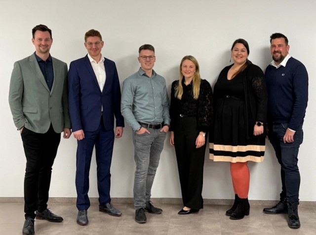v.l. (Jannick Thomm (Vorstand), Christian Borch (Vorstandsvorsitzender), Sebastian Berlemann (Vorstand), Annika Brüning (Vorstand), Helena Schmidt (Vorstand), Dirk Kölschbach (Geschäftsführer). (Foto; Wirtschaftsjunioren Oberberg)