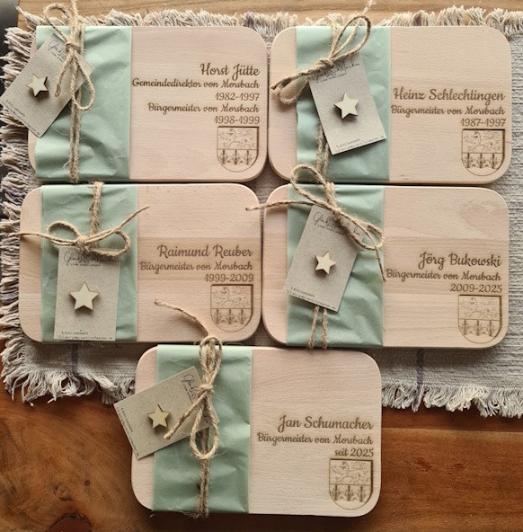 | Jeder Bürgermeister erhielt beim gemeinsamen Treffen im Rathaus ein Frühstücksbrettchen mit seiner eingravierten Amtszeit. Foto: Christoph Buchen |
