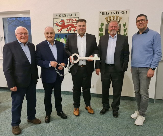 | Gaben sich nacheinander den Rathausschlüssel in die Hand: Die Morsbacher Bürgermeister Heinz Schlechtingen, Horst Jütte, Jan Schumacher, Raimund Reuber und Jörg Bukowski (v.l.n.r.). Foto: Christoph Buchen |