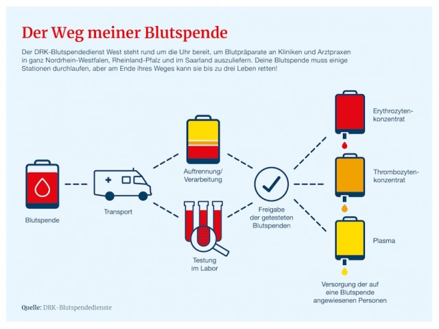 Der DRK-Blutspendedienst West gewährleistet eine sichere medizinische Grundversorgung für mehr als 23 Millionen Menschen in seinem Einzugsgebiet. Insgesamt stellt das DRK 78 Prozent des gesamten Blutbedarfs bereit.