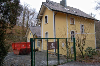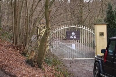 Wiehl - Totenkopf-Flaggen am Tor erinnern an den Brand im Anwesen von Rainer Gaertner. Dort soll es Ende Januar zu einer Kundgebung mit Dr. Edmund Haferbeck kommen, der schon gegen Papst und Justiz wetterte und bei einer Demo mit der Sekte Universelles Leben das Wort ergriff.