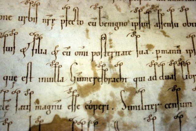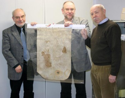 Diese Urkunde soll leihweise in die Kreisstadt gebracht werden und dort im Rahmen der Ausstellung "Kostbarkeiten Gummersbacher Geschichte" ausgestellt werden. Nach einer freundlichen Begrüßung durch Dr. Joachim Oepen beginnt der Abstieg in die Lagerräume des Archivs. Der erste Eindruck ist ernüchternd: Keine verstaubten Kellergewölbe, stattdessen neon-beleuchtete Gänge, durch die es vorbei an unzähligen Türen zum Raum "Urkunden" geht. Und dann umweht die Historiker doch noch der Hauch der Geschichte: Hier im "Urkundenschrank 3" hängt die Mappe "A I 15". Sie enthält die Urkunde, in der Erzbischof Friedrich I. verfügte, die ihm zustehende Kathedralsteuer auf ein Viertel der ursprünglichen Summe herabzusetzen, und zwar für die „ecclesia que est in villa Gumeresbracht“ (die Kirche, welche im Dorf Gummeresbracht ist). Für einen Moment kehrt fast andachtsvolle Stille ein, als die Gummersbacher Historiker das kostbare Stück begutachten. "Ein so altes Dokument hält man nicht alle Tage in Händen", sagt Gerhard Pomykaj. Bei ihm selbst liegt das zwölf Jahre zurück, damals war die Urkunde schon einmal für einige Tage zu Austellungszwecken in Gummersbach. Dr. Oepen erläutert die Besonderheiten mittelalterlicher Dokumente, so z. B., dass sie oft aus Pergament vom Rind verfasst wurden und Jürgen Woelke stellt schmunzelnd fest: "Die letzten Sätze musste der Schreiber kleiner schreiben, damit der Erlass des Erzbischofs noch auf die Kuhhaut ging."