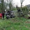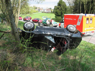 Reichshof/Berghausen - Vermutlich ist nicht angepasste Geschwindigkeit Ursache für den Unfall eines jungen Autofahrers, der Ortsausgang Reichshof/Berghausen nach rechts von der Fahrbahn abkam, eine Böschung hoch rauschte, gegen Strauchwerk prallte, auf die Seite kippte und vor einem Baum mit einem Totalschaden von rund 15.000 Euro liegen blieb. (soh-21.4.2004 23:53)
