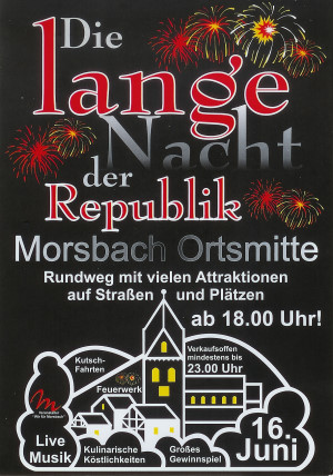| „Wir für Morsbach“ | Teilnehmer der „Langen Nacht der Republik“Bistro "Alt Morsbach" Brillenstube Grimmig Renate Steiger Tasso Siegfried Dietschi Jugendzentrum Stangier Frisöre Evang. Kirchengemeinde Stausberg Partyservice Ronni Kutiak Singkreis Carsten Schmitz Reisebüro Central Weinhandel Faber Malerbetrieb Horst Klein Visible-change Lotto Toto Hess Sonnenstudio Möbelhaus Schneider Bau- & Brennstoffe Bender Eischeid