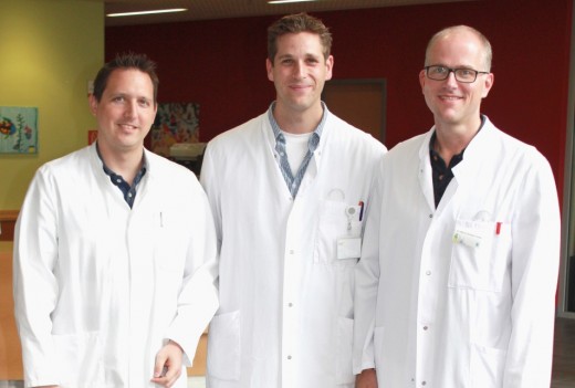 | Leitender Arzt Dr. Björn-Christian Vehse (rechts) und Chefarzt Dr. Stefan Beyerlein (links) begrüßen den neuen Oberarzt Dr. Christian Wolf-gang Sippel (Mitte) auf dem Wellersberg (Foto: DRK-Kinderklinik Siegen) |