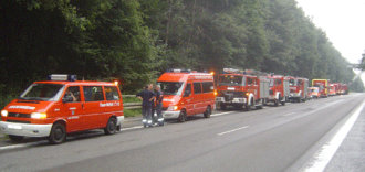 | Einsatzfahrzeuge am Sammelpunkt Autobahnausfahrt Moitzfeld auf der A4 auf dem Weg zum Marienfeld |