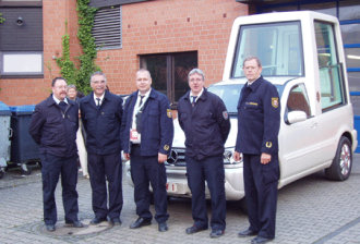 | Führende Einsatzkräfte vor dem "Papamobil" v.l.n.r. Brandamtsrat Friedhelm Bals, (Oberbergischer Kreis) Stadtbrandinspektor Friedhelm Köster (Gummersbach), Kreisbrandmeister Uwe Lomberg (Oberbergischer Kreis), Stadtbrandinspektor Wilfried Fischer (Radevormwald), Stellv. Kreisbrandmeister Hans Josef Ueberberg (Oberbergischer Kreis) |