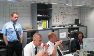 | Blick in den Bereich der TEL (Technischen Einsatz-Leitung) Marienfeld v.l.n.r. Stadtbrandinspektor Peter Pesch (Euskirchen) Kreisbrandmeister Uwe Lomberg, Stadtbrandinspektor Hans-Werner Dünnweg (Burscheid) Petra Ulm (Kerpen) |