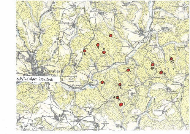 Morsbach/Friesenhagen - Insgesamt 21 neue Windkraftanlagen mit einer Gesamthöhe von je 200 Metern sollen im Grenzgebiet der Gemeinden Reichshof - Kirchen - Morsbach entstehen. In dem ebenfalls an das Morsbacher Gemeindegebiet angrenzenden Gelände zwischen Steeg, Köppernöll und Helmert seien alleine 12 Windenergieanlagen in der Größenordnung von 200 Metern geplant, heißt es im Morsbacher "Flurschütz". Aber auch die Windräder in Reichshof und Kirchen sind aufgrund ihrer enormen Höhe von weiten Teilen Morsbachs zu sehen. Weiter stellt sich die Frage, ob die riesigen Windräder den Bau einer Forensik in Reichshof beeinflussen könnten. Am kommenden Donnerstag findet in der Mehrzweckhalle in der Klosterstraße in Friesenhagen eine Infoveranstaltung statt.