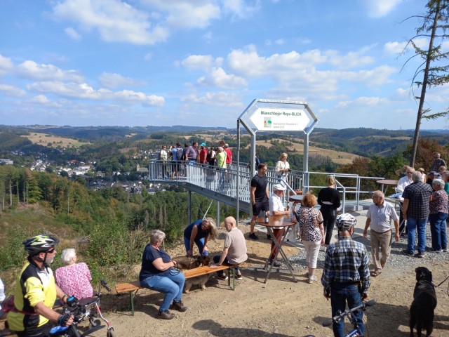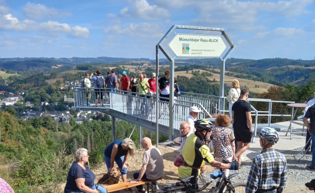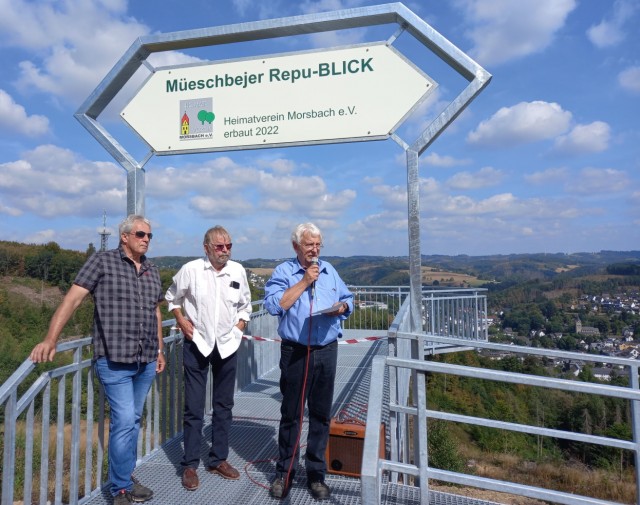 |  |  | Einweihung der Aussichtsplattform durch (v.l.) Werner Schuh, Klaus Jung und dem ersten stellvertretende Bürgermeister Reiner Borbones. |  |  Zahlen und Fakten zur neuen Aussichtsplattform „Müeschbejer Repu-BLICK“