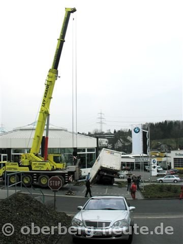 Zwei Kranfahrzeuge bergen LKW