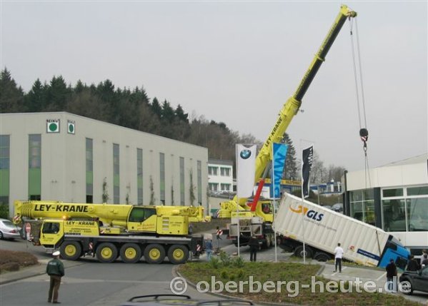 Zwei Kranfahrzeuge bergen LKW