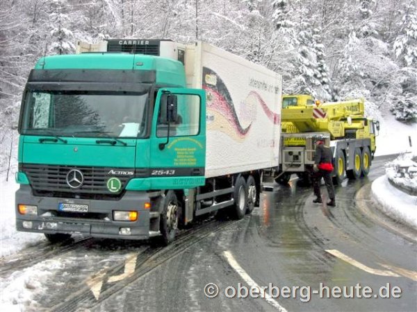 Blechschäden und quer stehende LKW auf verschneiten Straßen