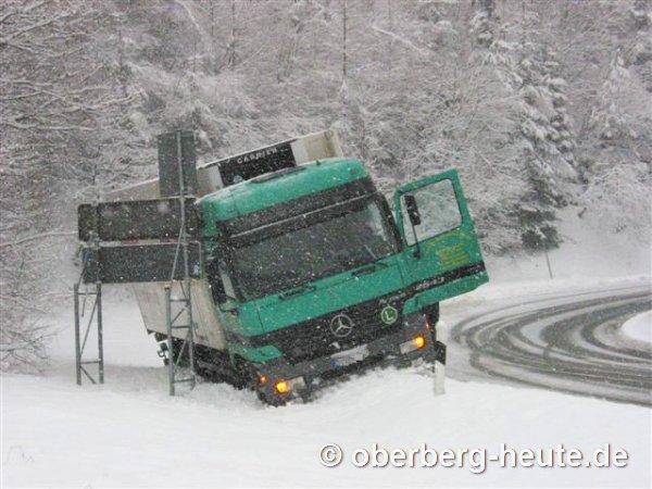 Blechschäden und quer stehende LKW auf verschneiten Straßen