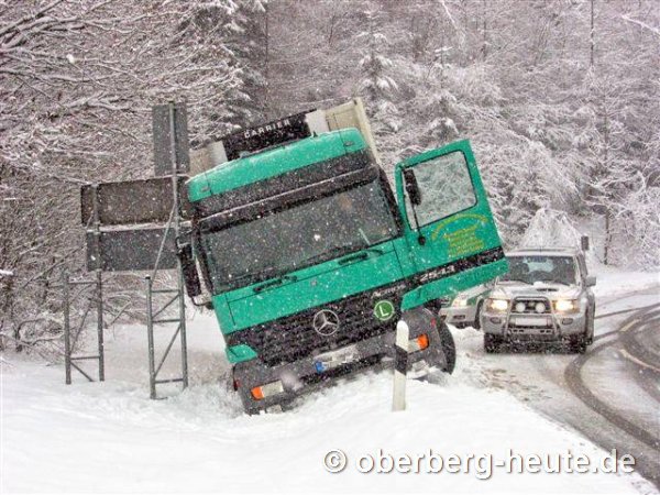 Blechschäden und quer stehende LKW auf verschneiten Straßen