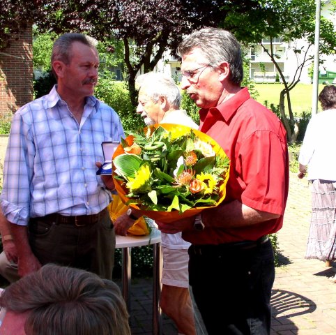 Werner Puhl überreicht gratuliert Heinz Stockhausen mit einem Blumenstrauß