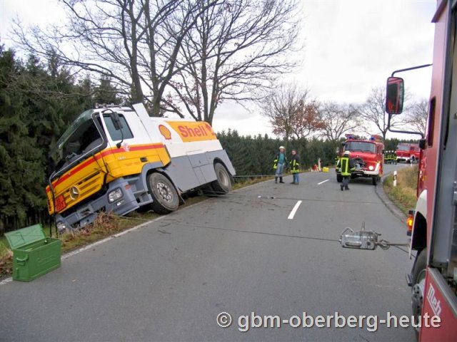 Tanklaster prallte gegen Baum und drohte abzustürzen