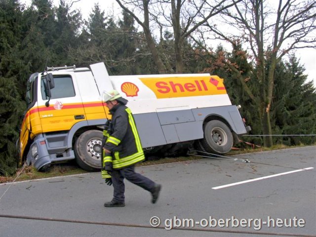 Tanklaster prallte gegen Baum und drohte abzustürzen