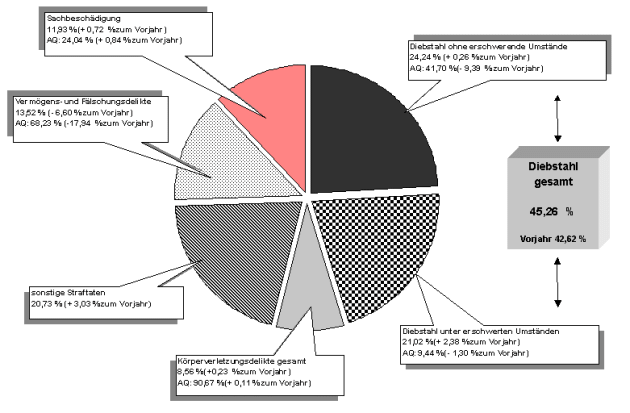 Wesentliche Veränderungen ergaben sich bei den Kfz-Delikten mit erheblich steigenden Zahlen, den Rauschgiftdelikten und den Straftaten gegen die sexuelle Selbstbestimmung. Ein Rückgang zeigten der Wohnungseinbruch und Raubdelikte.