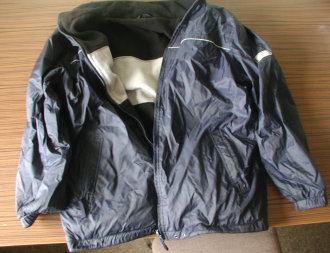 Er trug eine blaue Windjacke mit schwarzem Fleecefutter und ein hellbraunes Shirt.