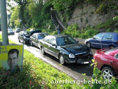 Derschlag - Vier Autos wurden heute gegen 17:45 Uhr in einen Auffahrunfall verwickelt. Ein roter PKW hatte wegen eines Verkehrsstaus angehalten und eine Kettenreaktion von Crashs ausgelöst. Hinter ihm war ein BMW Fahrer ungebremst auf einen Ford aufgefahren, der wiederum prallte auf einen weiteren PKW.