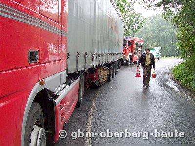 Reichshof - Völlig zerstört wurde ein PKW als dessen ortsunkundiger Fahrer zwischen Buchen und Dreschhausen in einer engen Kurve auf die Gegenfahrbahn geriet und dort mit einem LKW zusammenstieß. Bei dem Aufprall wurde auch der Sattelzug erheblich beschädigt. Da unter anderem die Bremsleitung abgerissen war, wurden umfangreiche und langwierige Bergungsarbeiten nötig. Der fahruntüchtige LKW blockierte über Stunden eine Fahrspur. Die Freiwillige Feuerwehr streute auslaufende Betriebsstoffe ab und leistete technische Hilfe während der Bergungsabreiten.