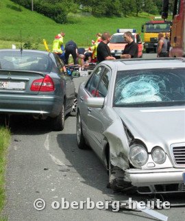 Gummersbach-Hardt - Heute Mittag überholte ein PKW-Fahrer auf der Landstraße 173 einen in Richtung Piene voraus fahrenden LKW. Während des waghalsigen Überholvorgangs kam dem Fahrer ein Mercedes entgegen. Das versuchte Ausweichmanöver scheiterte. Die beiden PKW stießen zusammen. Ein Fahrer wurde schwer verletzt. An beiden Fahrzeugen entstand hoher Schaden. (oh-2.8.2005 14:21)