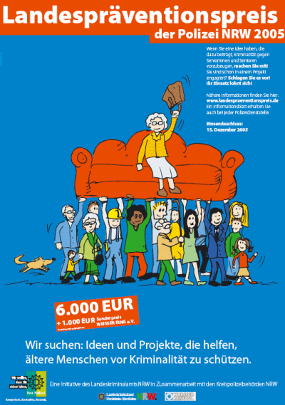 Das Landeskriminalamt NRW sucht Ideen und Projekte, die dazu beitragen, das Leben älterer Bürgerinnen und Bürger sicher zu gestalten und Kriminalitätsängste abzubauen. Der Wettbewerb richtet sich an die gesamte Bevölkerung in NRW. Kreativität und Seriosität der Projekte stehen im Vordergrund.